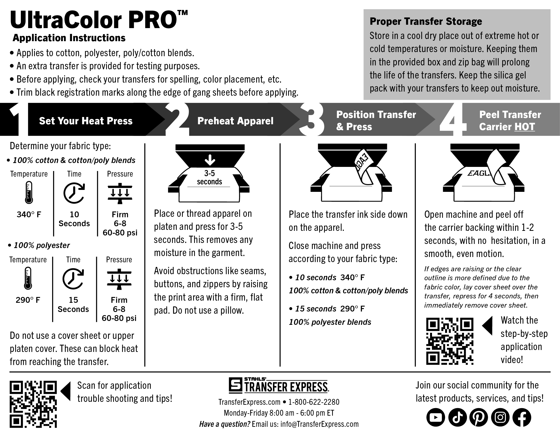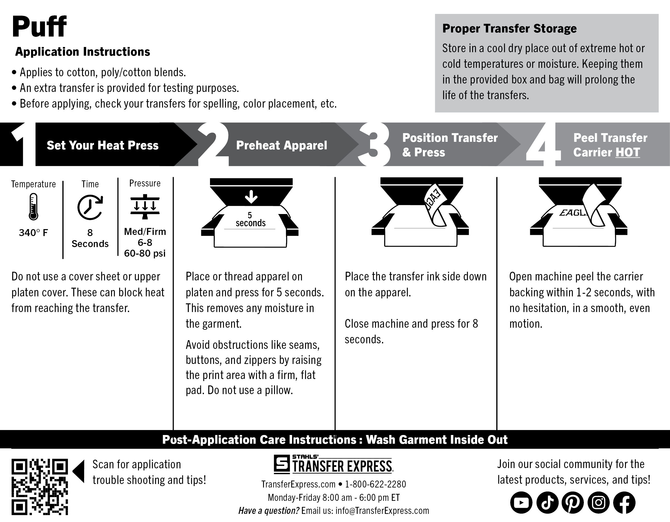 - Pre-Press: 3-5 seconds to remove moisture from the garment